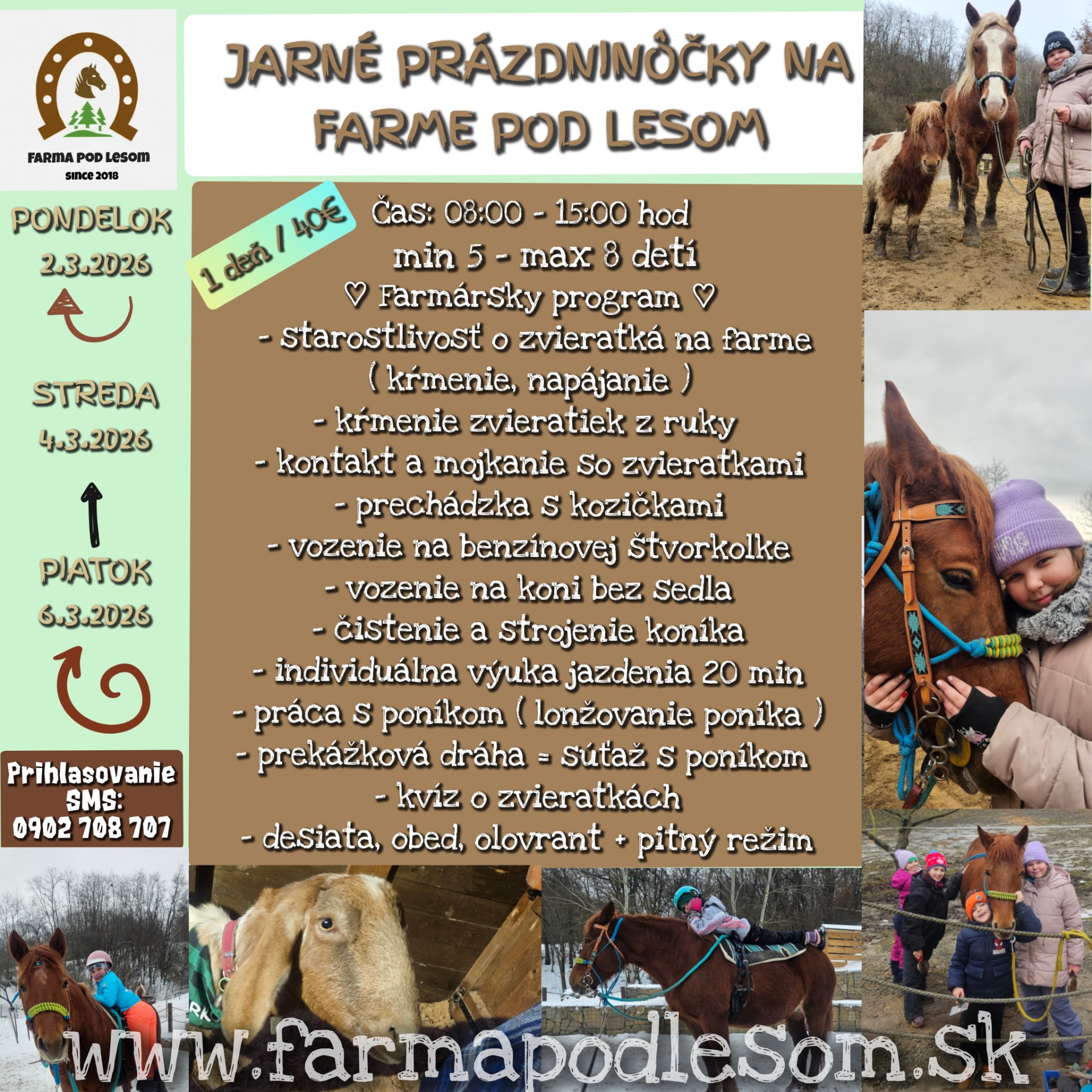 Všetko u nás prebieha v rodinnej atmosfére, výučba je vedená s láskou a trpezlivosťou. U nás pod lesom sú vítané celé rodinky. Na detičky čaká detské ihrisko - pieskovisko, hojdačky, šmýkačka, odrážadlá, šliapacia kára, el.autíčko, zip line - mini dráha, lanová dráha ninja a veľká trampolína. Máme aj ohnisko, takže kľudne si môžete u nás aj poopekať na ohníku obedík či večeru. Zvieratká sa potešia suchému chlebíku, piškótkam, mrkvičke či jabĺčkam.